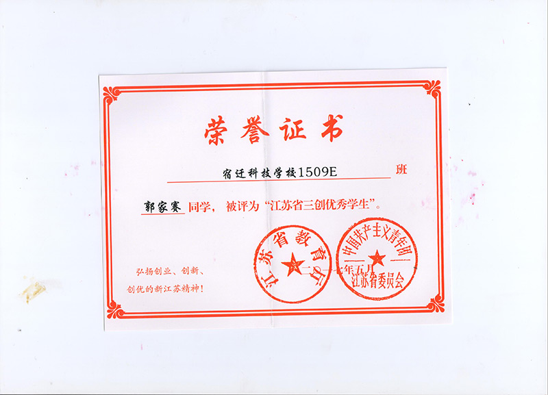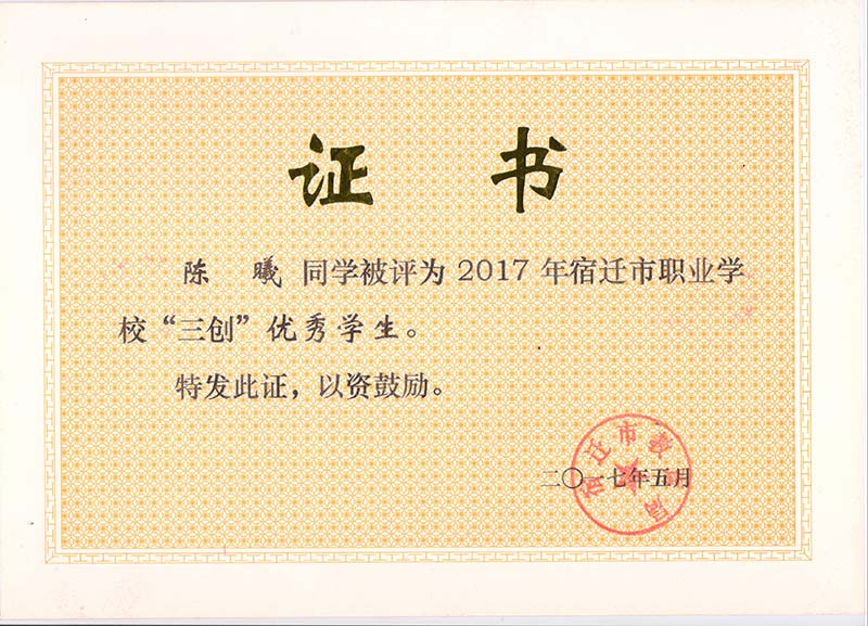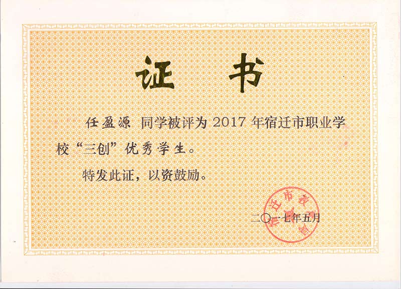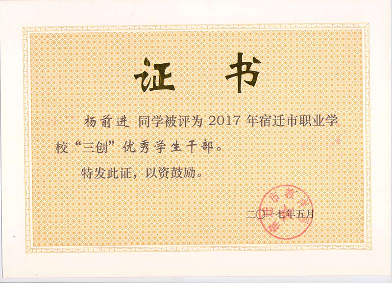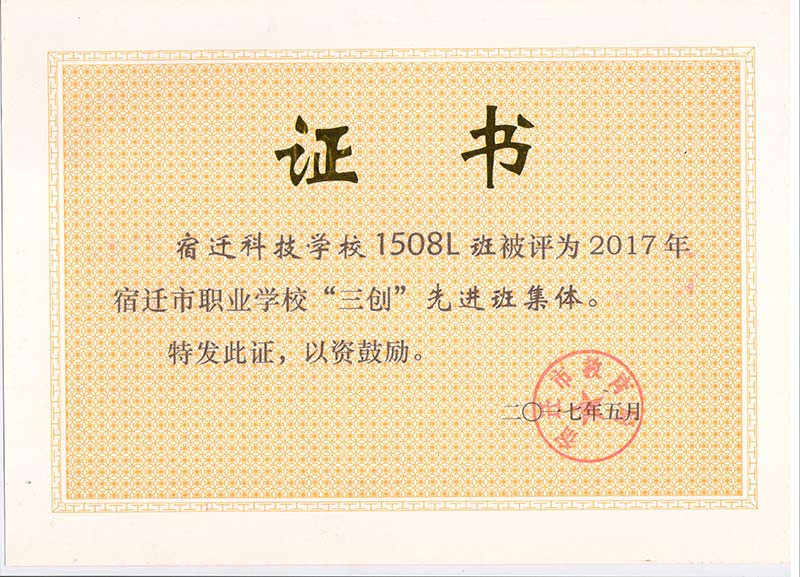 近年来,宿迁科技学校在各级党委、政府和教育行政部门的领导下,切实加强和改进职业学校德育工作,坚持把德育放在首位,采取多种形式,培养具有高尚职业道德和创业创新创优精神的高素质劳动者和高技能人才,涌现出一批德、智、体、美、劳全面发展的优秀个人和先进集体。在此次评选表彰中,郭家赛同学被评为江苏省三创“优秀学生”;陈曦、任盈源被评为宿迁市三创“优秀学生”称号;杨前进被评为宿迁市三创“优秀学生干部”称号;宿迁科技学校1508L班被评为宿迁市三创“先进班集体”;称号。