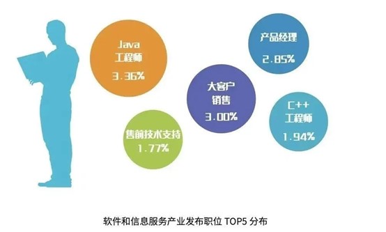 软件与信息服务产业职位需求前五位:Java工程师、大客户销售、产品经理、C++工程师、售前技术支持。