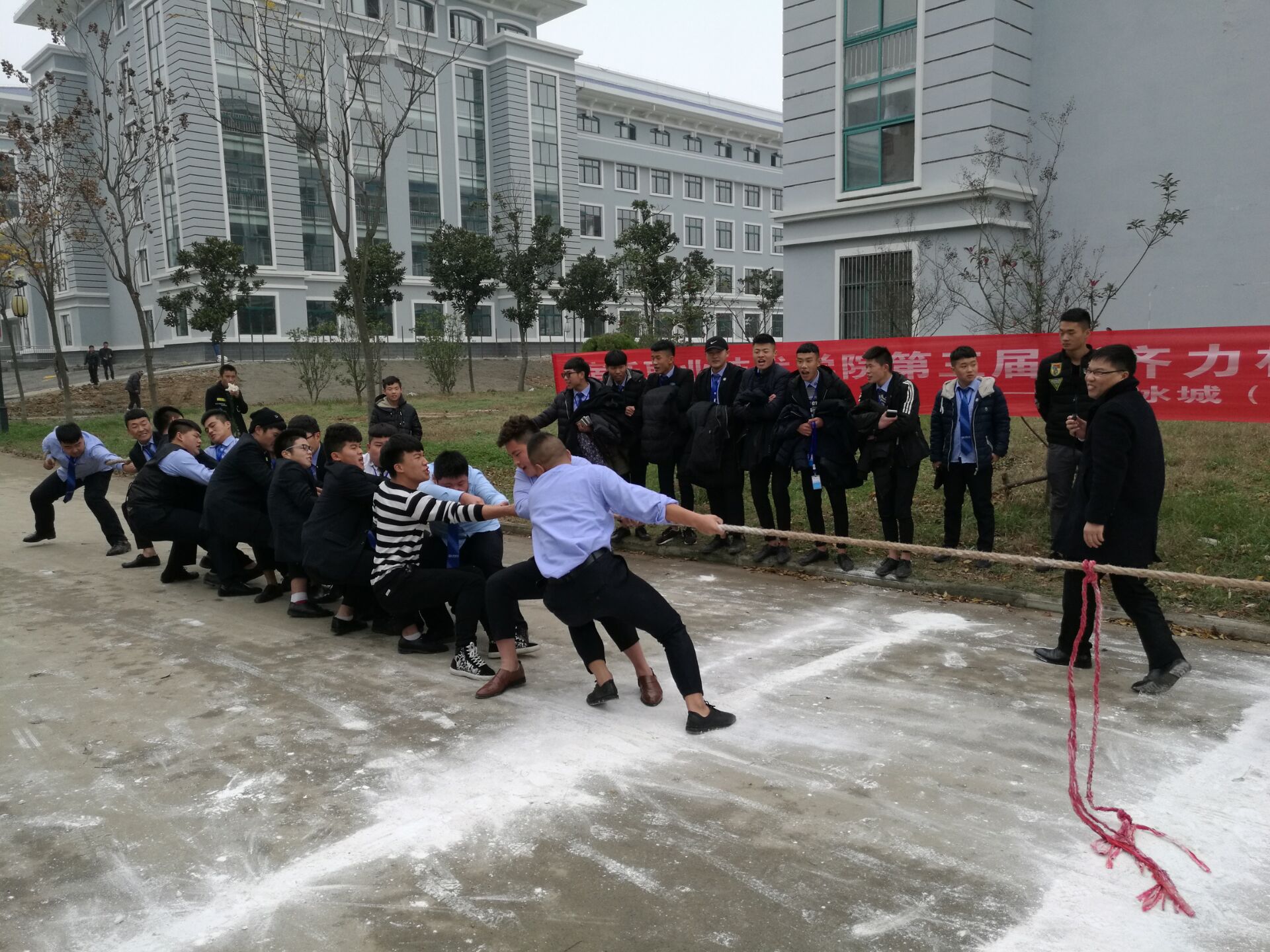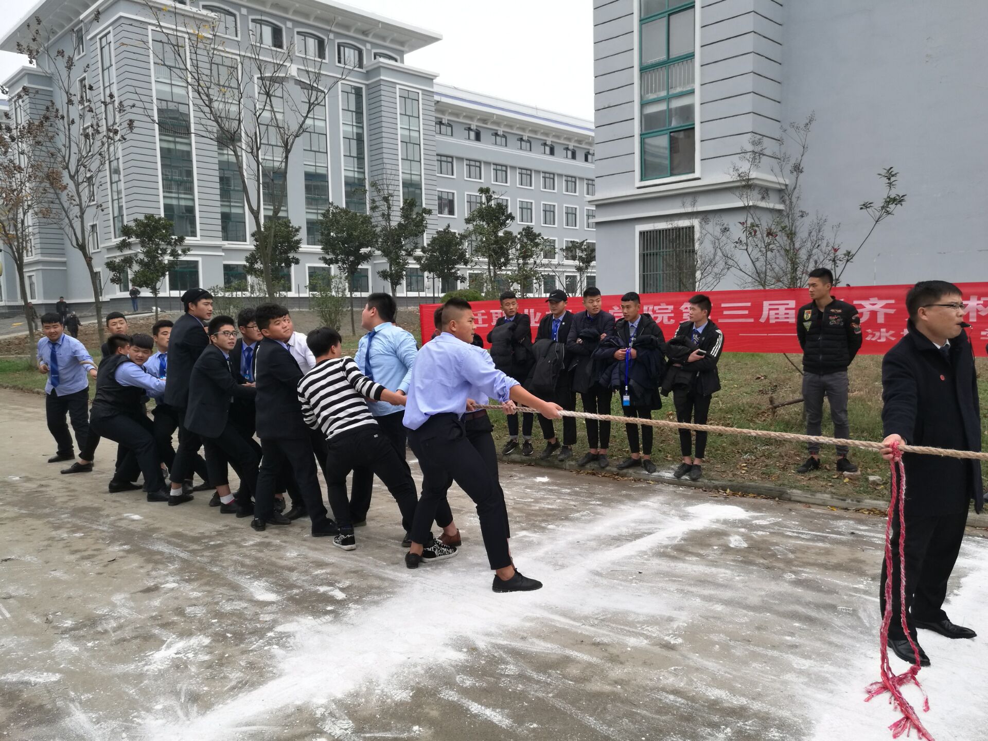 为丰富大学生的课余文化生活,增进学生之间的交流,培养大学生的团队协作能力。团委学生会于11月21日在学院餐厅门口举办“齐力杯”拔河比赛。出席本次活动的领导有学管处苗福涛处长、团委书记高琳及各系部学生科长和部分辅导员老师。
