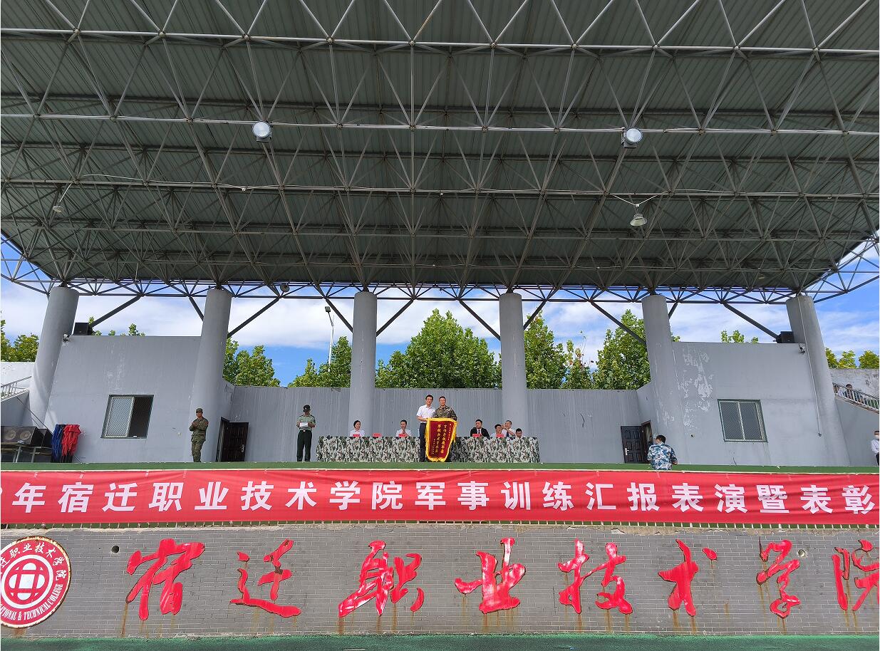最后,党委书记周俊波同志为承担本次军训任务的中国人民武装警察部队授予锦旗,并代表学校向承担本次军训任务的中国人民武装警察部队宿迁支队军官们表达了衷心的感谢和崇高的敬意,同时,他对2023级学生在军训过程中表现的优良素质、坚强意志和取得的成果表示肯定,他表示“经过短短15天的训练,同学们的军事素养和精神面貌发生了如此可喜的变化,我们要感谢同学们的艰苦努力,更要感谢不辞辛苦、不避风雨、精心组织、严格施训的教官们。你们以严整的军容、优良的作风、过硬的素质和一丝不苟、又极具亲和力的工作精神,展示了新时期军人的良好形象,赢得了师生们的钦佩和爱戴。新生入校的第一堂课是你们执教的,你们是新生的第一老师。值此,让我们以热烈的掌声向承担训练任务的中国武装警察部队宿迁支队的官兵表示崇高的敬意和由衷的感谢”,他指出“十多天的军训,同学们不仅收获了同学情谊、师生情感,而且还增强了体质、磨练了意志。同学们认真训练,克服种种困难,保质保量地完成了军训任务,为学校交出了一份满意的答卷。短暂的军训生活必将成为同学们求学历程中永远难忘的时刻”。他强调“同学们,军训即将结束,但它带给我们的意义永远不会结束。它留下的是严格的组织纪律性和不怕苦、不怕累的作风,留下的是坚强的意志和不断追求、勇往直前的精神,留下的是强烈的爱国心和报效祖国的理想。明天,你们即将走进教室,“求索”于书山学海,开始新的征程。”