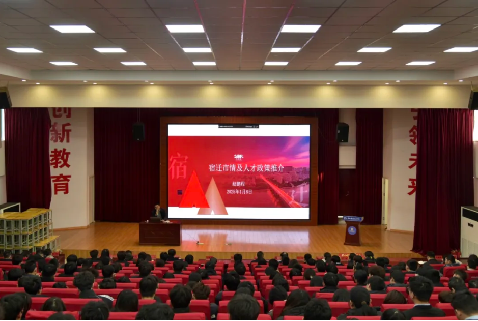 为认真贯彻落实江苏省教育厅、省hg6686和社会保障厅“关于2025届全省普通高校毕业生就业创业工作推进会”的会议精神,推进毕业生高质量就业,服务宿迁市区企业数转智改对新型人才的需求,1月8日,宿迁市人才服务中心组织宿城区、宿豫区、经济开发区、湖滨新区,苏宿工业园区、洋河新区党政部门、人才服务部门有关负责同志,部分上市公司、科创企业在我校联合举办“2025届毕业生就业政策宣讲会”。宿迁市人才服务中心主任赵鹏程、副主任葛霆,hg6686副校长任尔平,宿迁职教园区党委委员、管理办副主任钟学兵,湖滨新区组织宣传统战部副部长殷南燕,各区人才服务中心领导、hg6686招生就业处、相关二级学院负责同志、东贝机电(江苏)有限公司、江苏美丽源电子商务公司、 江苏风云动画公司、江苏精科能源公司的人事经理和我院三百名师生代表参加了此次宣讲会。