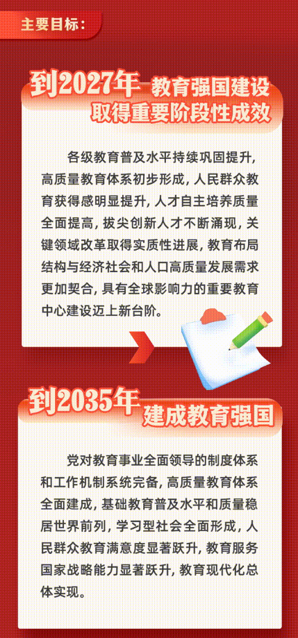 主要目标是:到2027年,教育强国建设取得重要阶段性成效。各级教育普及水平持续巩固提升,高质量教育体系初步形成,人民群众教育获得感明显提升,人才自主培养质量全面提高,拔尖创新人才不断涌现,关键领域改革取得实质性进展,教育布局结构与经济社会和人口高质量发展需求更加契合,具有全球影响力的重要教育中心建设迈上新台阶。到2035年,建成教育强国。党对教育事业全面领导的制度体系和工作机制系统完备,高质量教育体系全面建成,基础教育普及水平和质量稳居世界前列,学习型社会全面形成,人民群众教育满意度显著跃升,教育服务国家战略能力显著跃升,教育现代化总体实现。