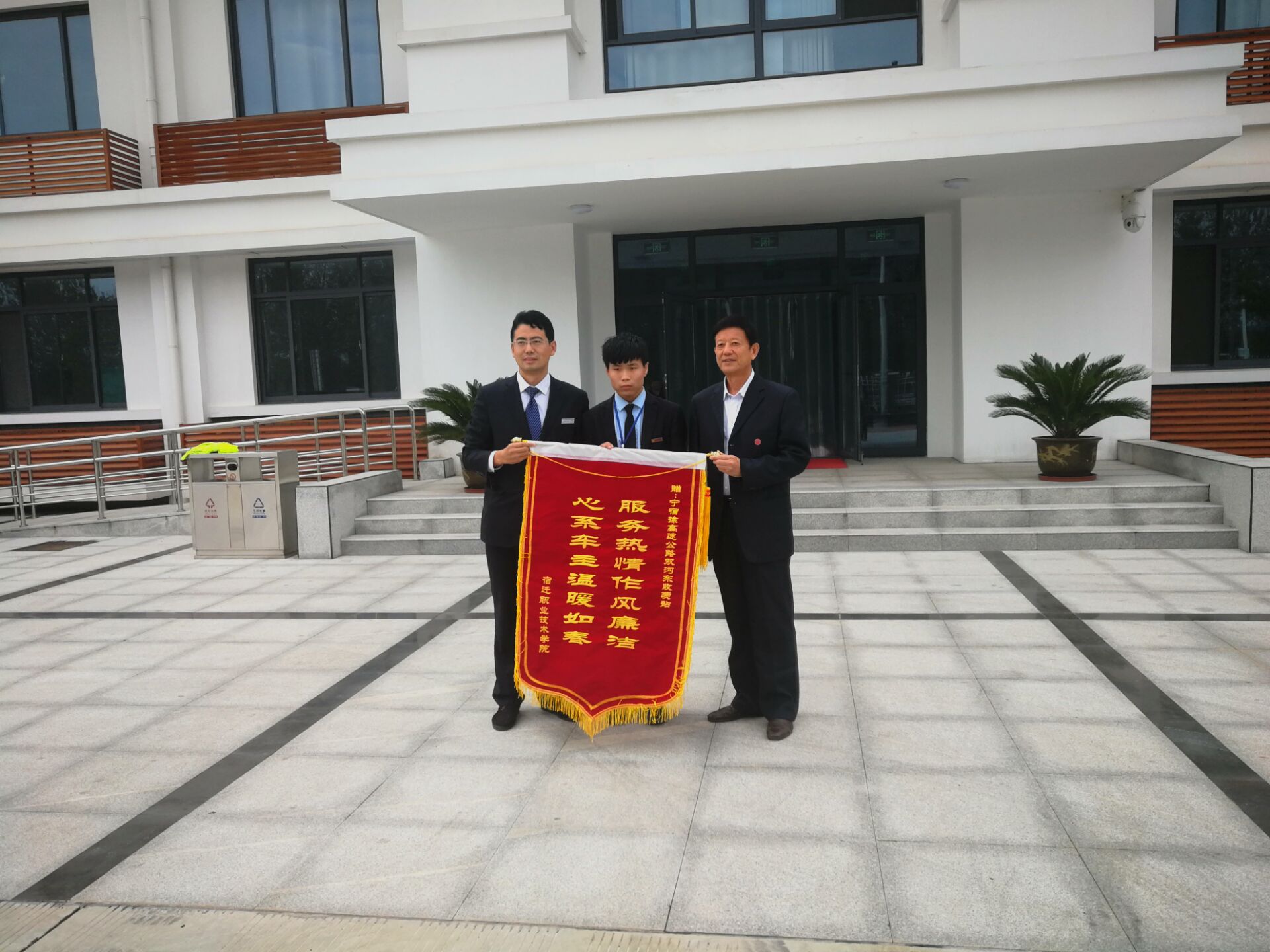 10月13日下午,皇冠hg6686将一面印有“服务热情作风廉洁、心系车主温暖如春”的锦旗送到宿迁高速公路双沟东收费站,感谢该站对皇冠hg6686学生的救助和热情服务。
