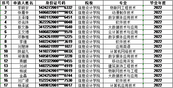 根据《省hg6686社会保障厅 省教育厅 省财政厅关于做好求职创业补贴发放工作的通知》文件精神,经毕业生自愿申请、学校初审,共有李晓宇等17名同学符合申请条件。现将名单予以公示: