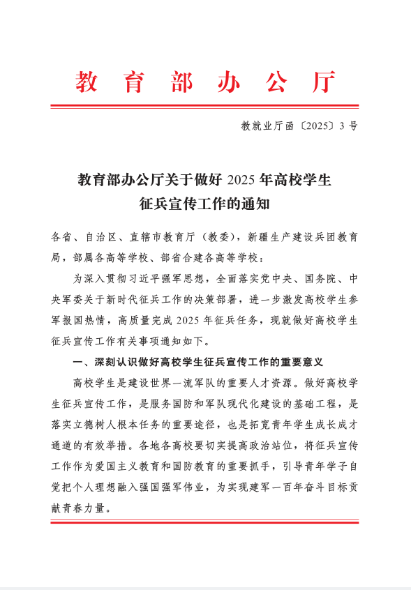 教育部办公厅关于做好2025年高校学生征兵宣传工作的通知 - 通知公告 - 皇冠hg6686