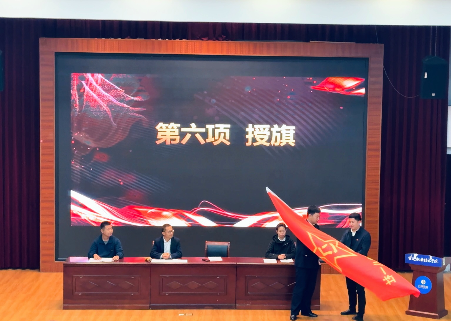 hg6686信息设计学院及信息科技学院党支部书记、学生工作处高琳为“八一社”授旗。